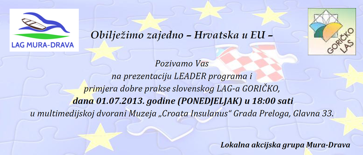 U sklopu obilježavanja ulaska Hrvatske u EU, LAG Mura-Drava Vas poziva na prezentaciju LEADER programa i primjera dobre prakse slovenskog LAG-a GORIČKO koja će se održati dana 01.07.2013. godine (PONEDJELJAK) u 18:00 sati u multimedijskoj dvorani Muzeja „Croata Insulanus“ Grada Preloga, Glavna 33, a prezentaciju će voditi gospodin Jasmin Kukec iz RRA MURA.